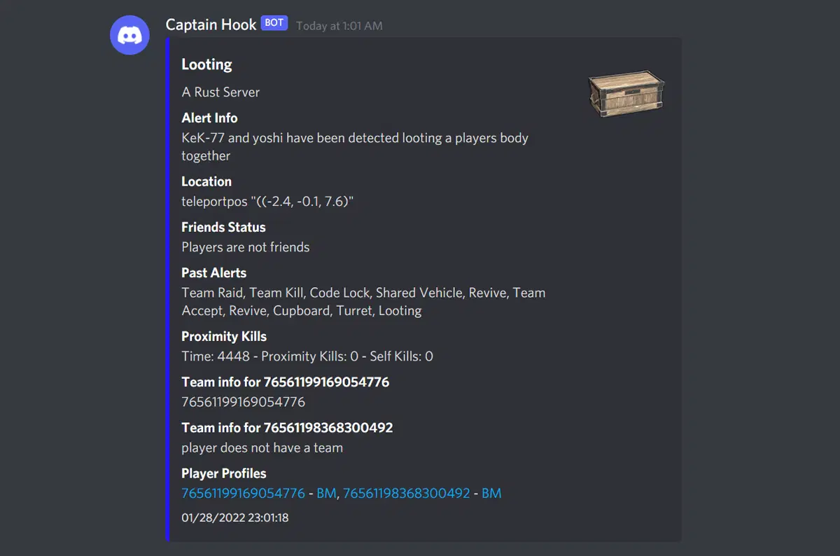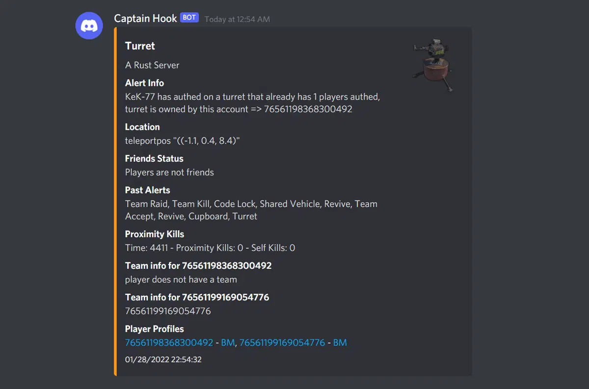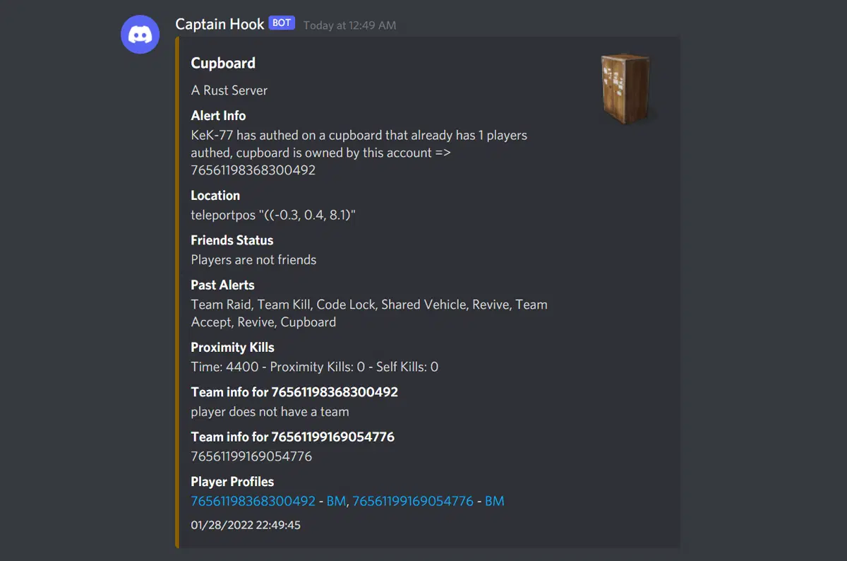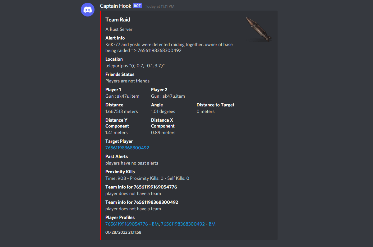 Все оповещения будут отправляться на указанный веб-хук раздора, вы можете настроить плагин так, чтобы он не отправлял определенные оповещения или не отправлял оповещения, если у игроков нет прошлых оповещений, это можно настроить для каждого оповещения. Встроенное предупреждение включает следующую информацию.- Имя сервера, на котором сработало оповещение.