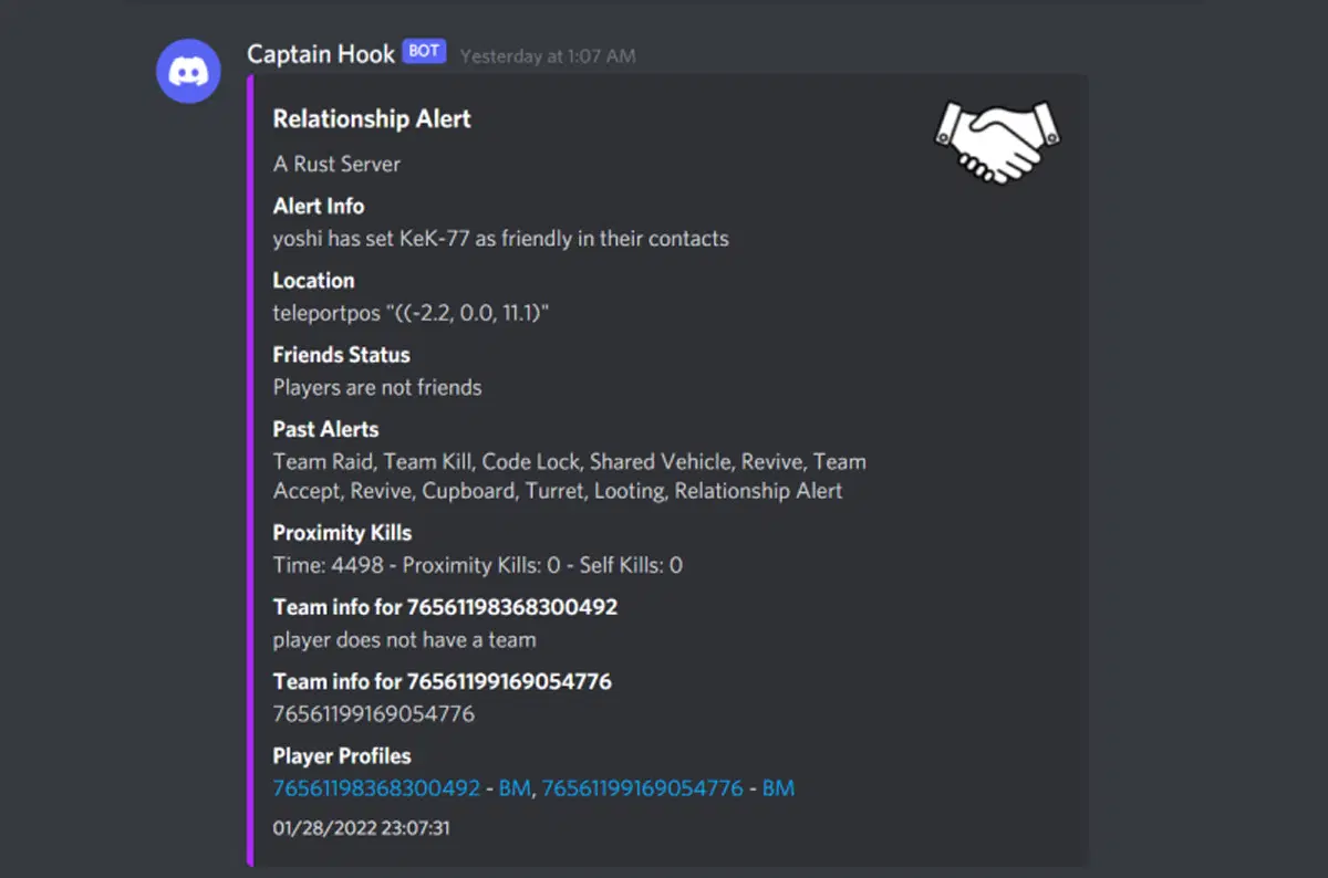 когда два игрока запускают оповещение, плагин автоматически проверяет список их друзей, чтобы узнать, являются ли они друзьями Steam, и включает результаты во встроенное оповещение. Это также можно настроить, чтобы увеличить вес автобана, если они друзья в Steam. Вы также можете установить минимальное количество дней, в течение которых пользователи были друзьями, чтобы их вес автобана был увеличен.Поддержка раздора: