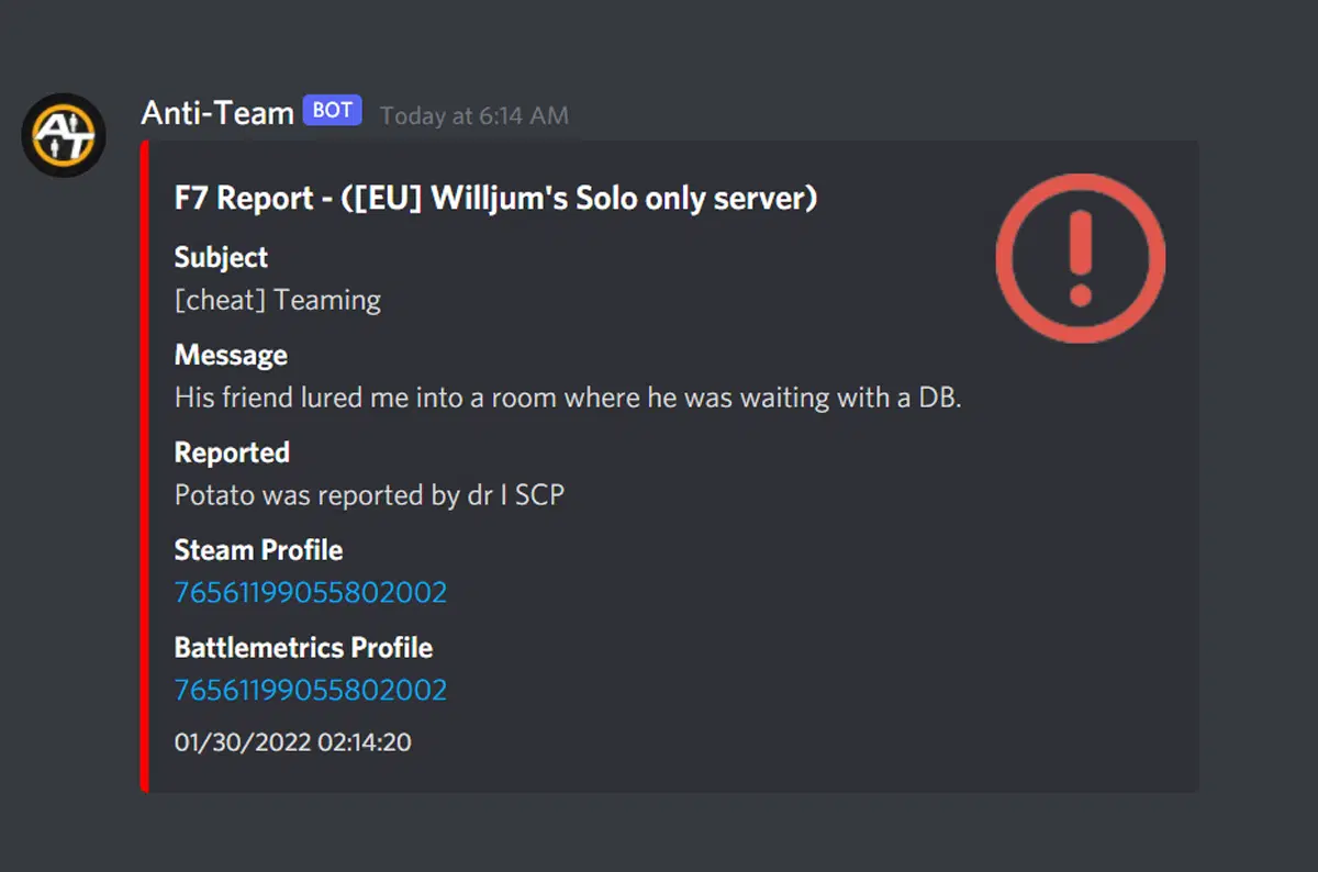 Когда игрок сообщает о другом игроке в команде через меню отчетов F7 (вы будете удивлены, сколько людей сообщают о команде через это).Оповещения о объединении: