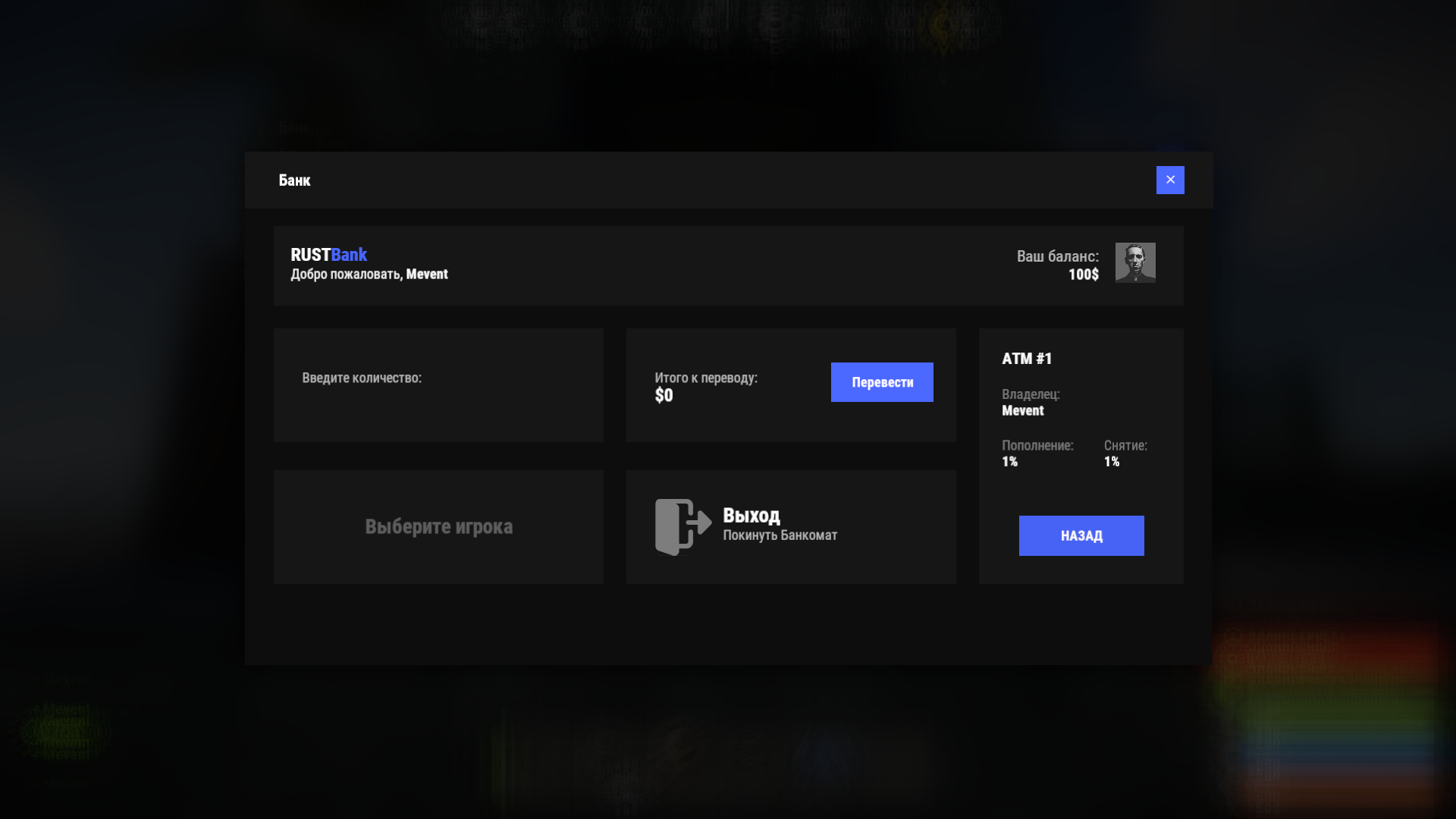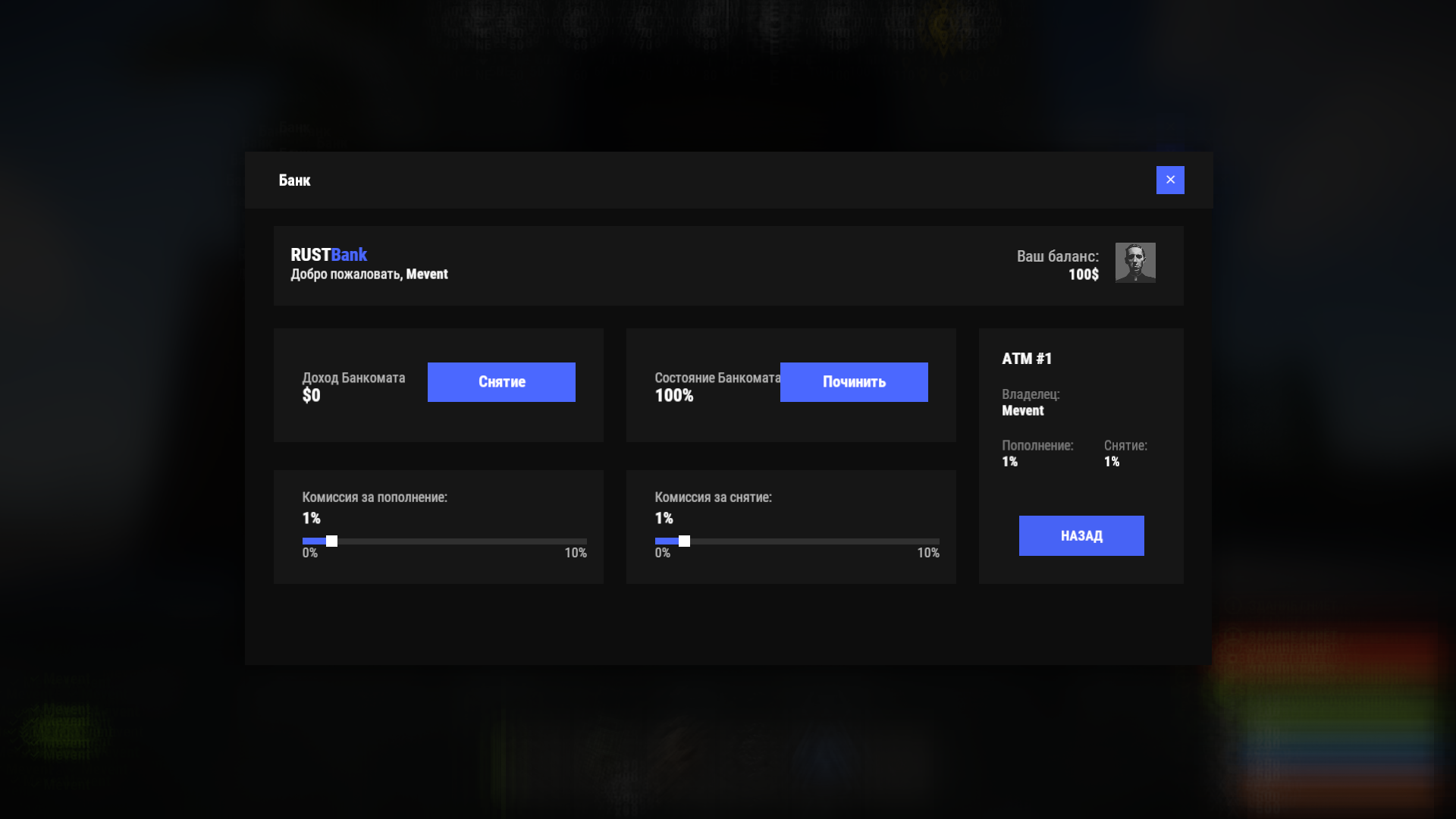 - Система Банкоматов (игрок может установить СВОЙ банкомат и получать доход с него)