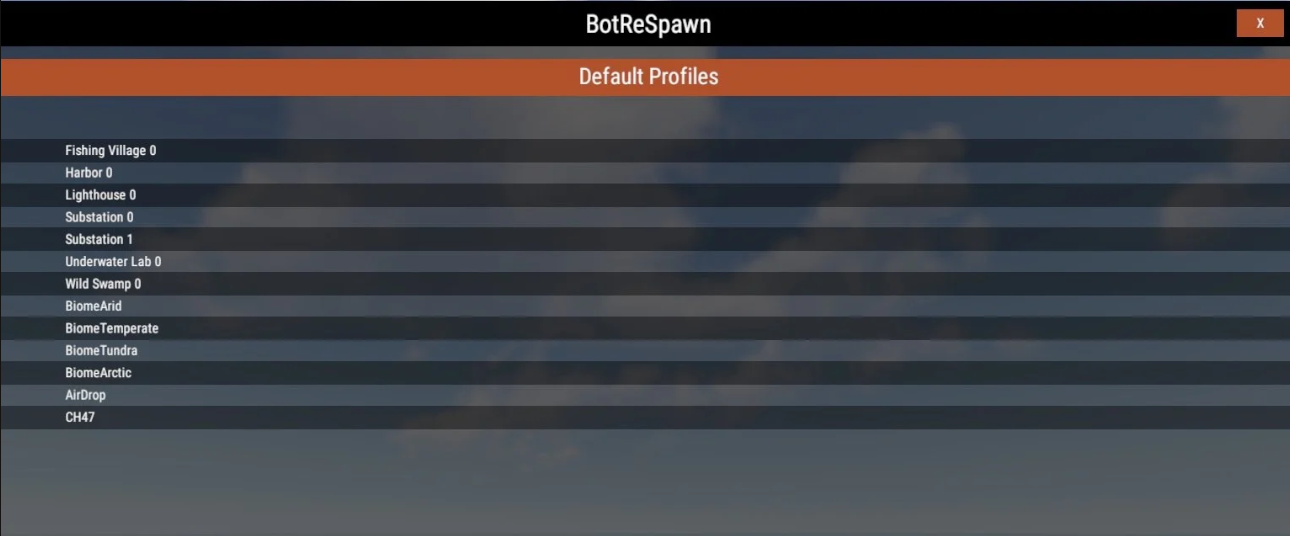 - /botrespawn add *profilename* — добавляет пользовательский профиль, затем открывает пользовательский интерфейс. (пожалуйста, не используйте пробелы или дефисы)