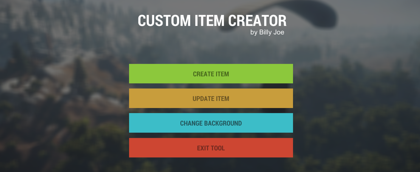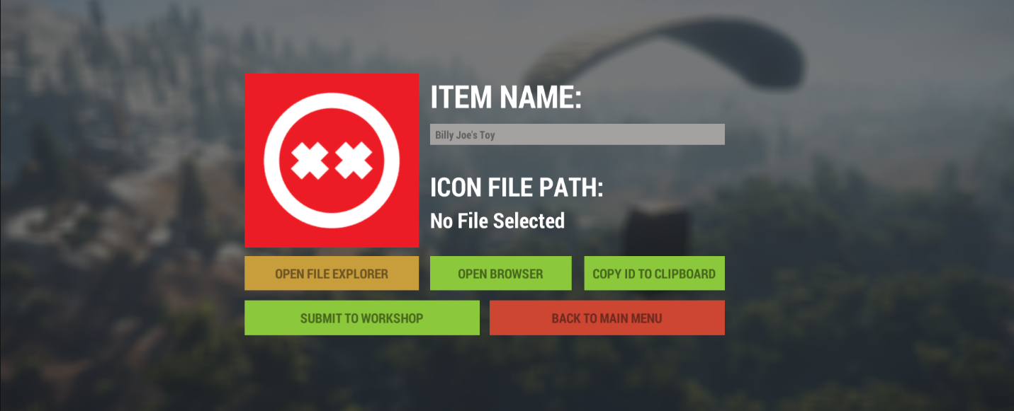 Это простой инструмент для разработчиков, которые хотят создавать нестандартные предметы. Он позволяет вам выбрать имя предмета (название мастерской) и изображение предмета в любом месте на вашем компьютере (.png) и загрузить его в мастерскую Rust Steam. Это позволит вам получить идентификатор мастерской, в которой вы используете для создания «нестандартного» предмета.