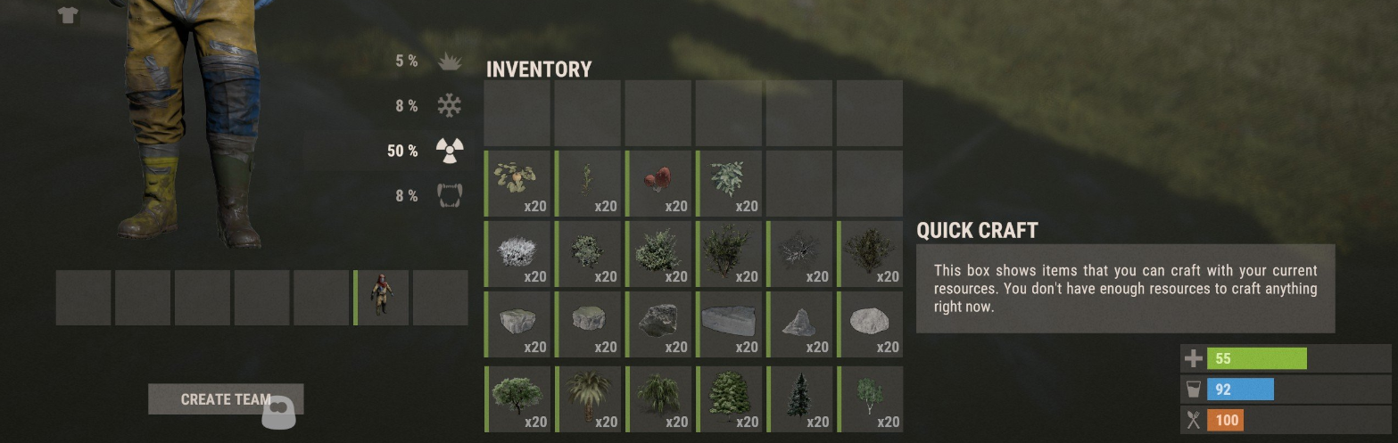 - Индивидуальная система сбора предметов. Игроки могут получить эти предметы, рубя деревья, добывая камни и собирая растения.