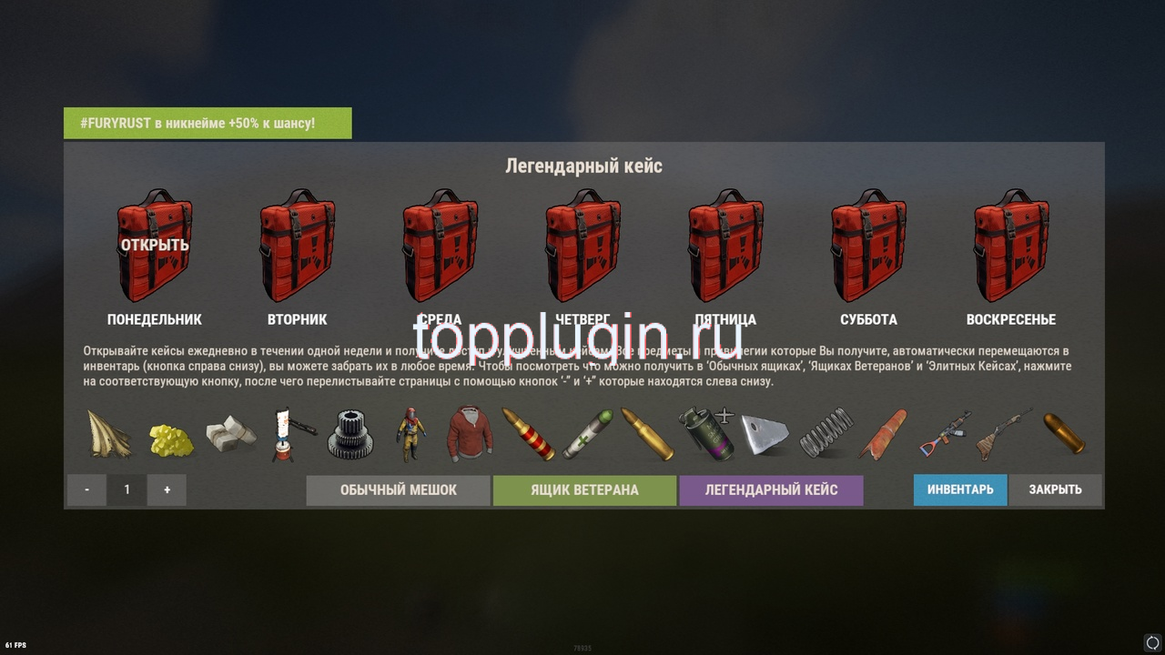 Игрок, заходя каждый день, может открывать кейсы в течении одной недели и получить доступ к более улучшенным кейсам. Весь лут хранится на складе игрока. Так же игрок может посмотреть, что ему может выпасть из опр. кейса.