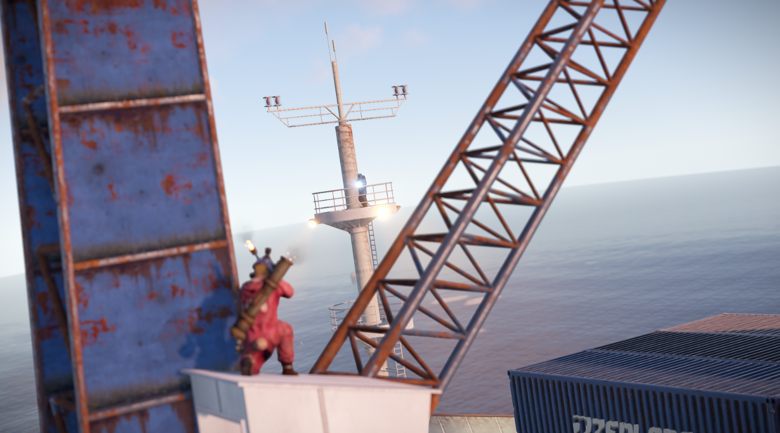 Вход в контейнер закрыт, чтобы открыть дверь, нужно нажать кнопку в кабине крана.