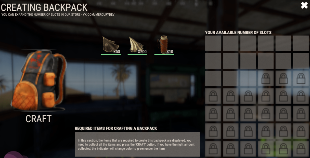 - Полная настройка интерфейса рюкзака с отображением слотов, полосы заполненности, открытия по нажатию на интерфейс