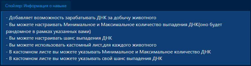 Игроки должны собирать очки ДНК для изучения, для этого они должны выполнять несложные условия, которые настраиваются в конфигурационном файле!