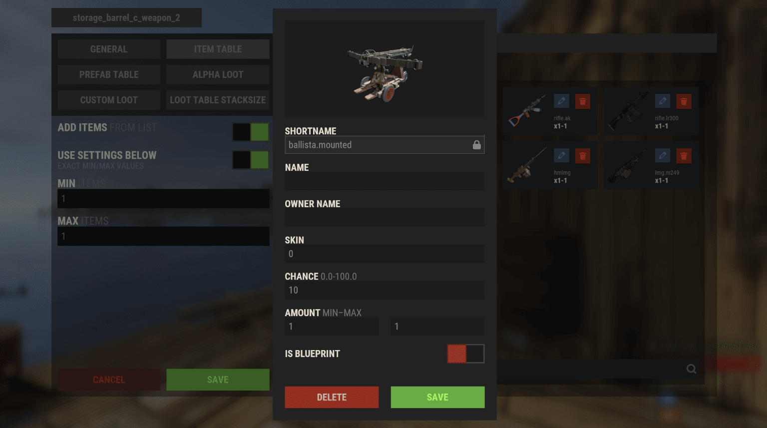 Чтобы применить таблицу добычи к конкретному объекту, просто введите её имя в конфигурации объекта в поле «LootManager Preset» плагина, который его создаёт.