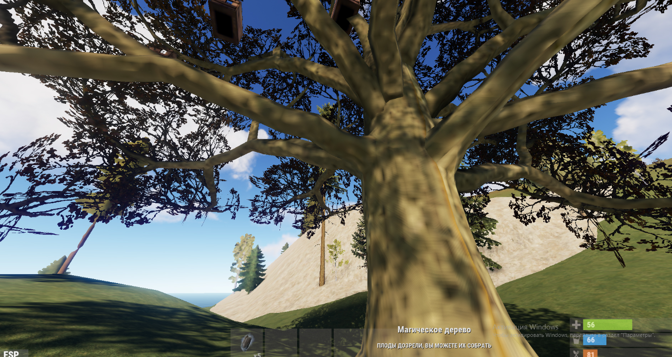 После полного созревания на дереве появляются ящики, при рубке они падают на землю. В ящике рандомной лут с конфигурации.