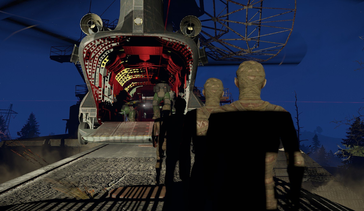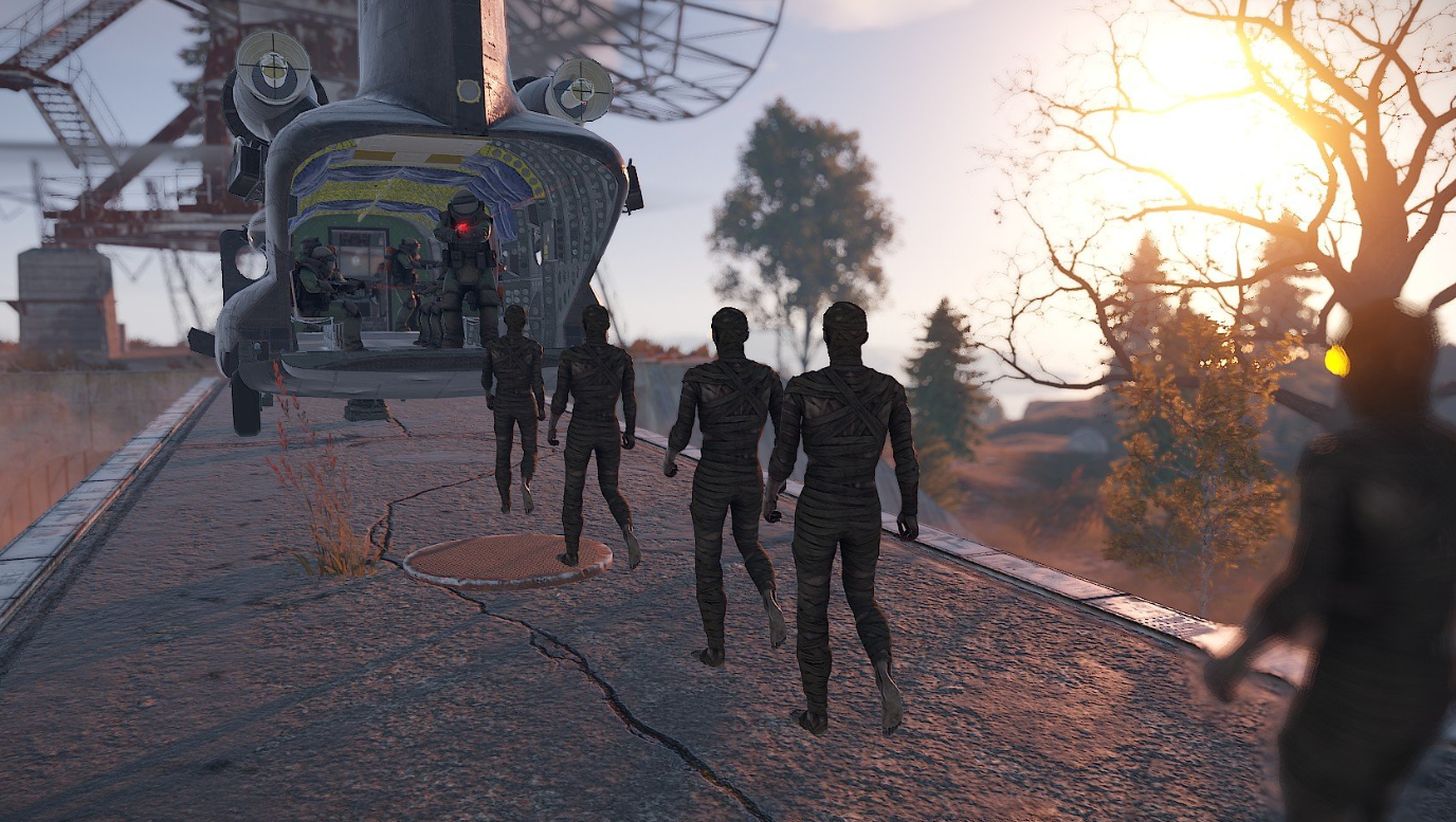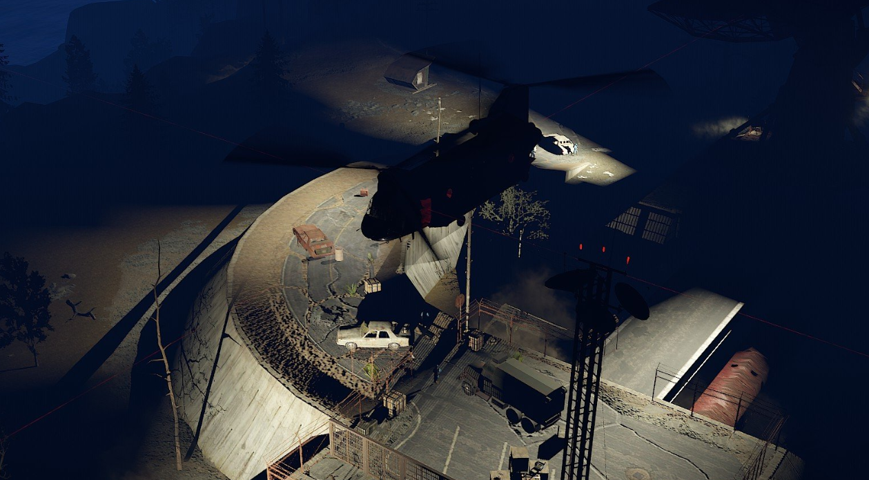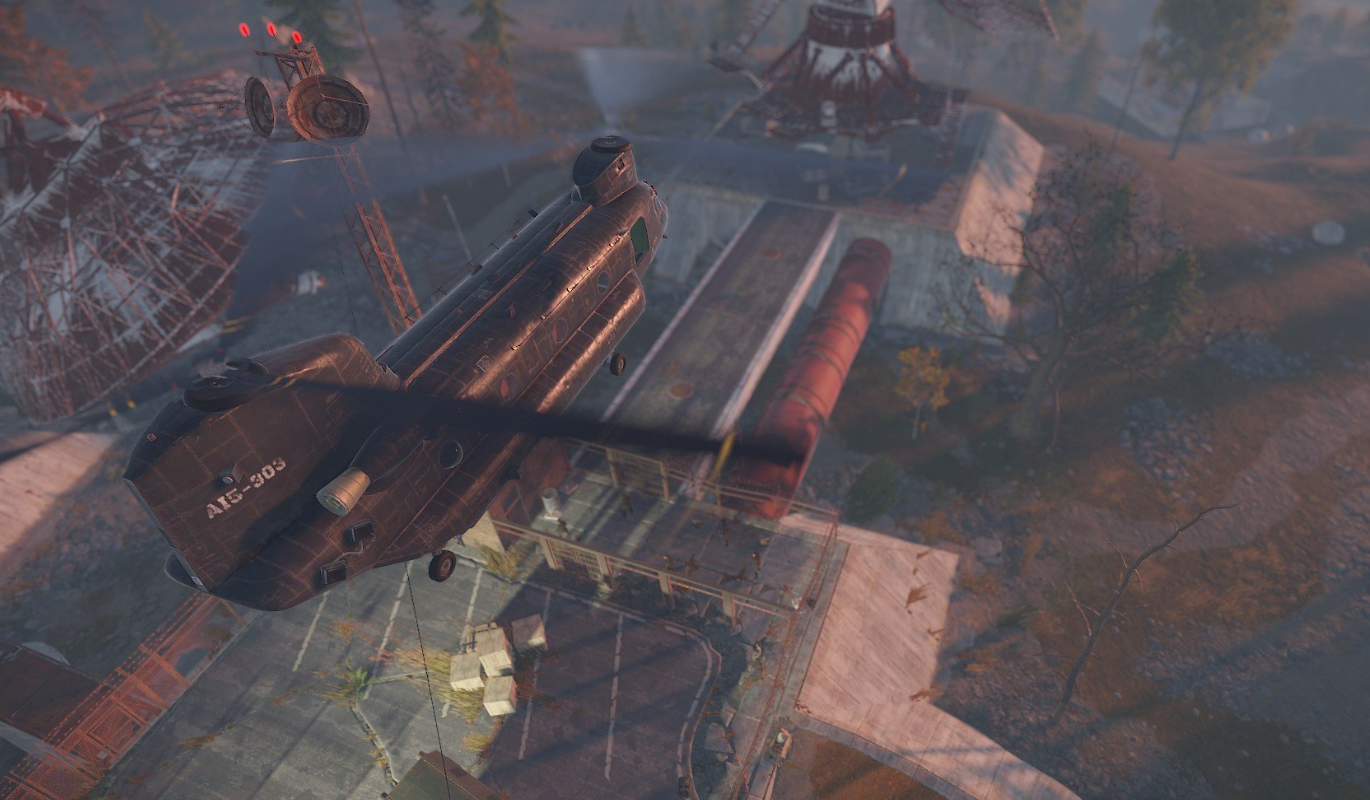 Когда прибудет CH47, он бросит запертый ящик в качестве оплаты за биологическое оружие. Затем он приземлится, и зомби начнут садиться на CH47. Как только CH47 подберет всех оставшихся зомби, он улетит с карты.