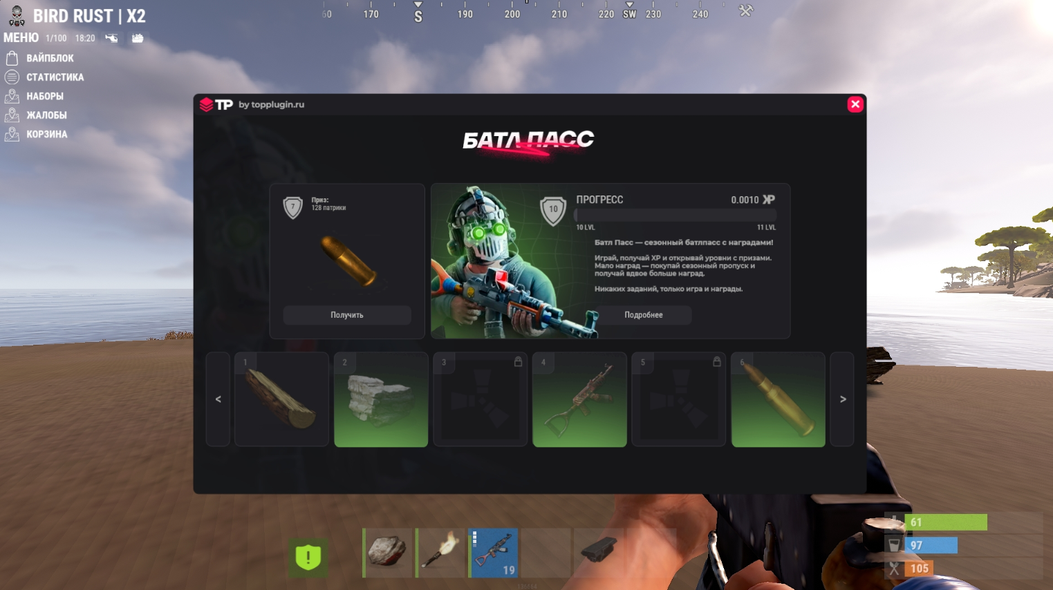 TPBPass – это сезонный батлпасс с наградами!За различные игровые действия — фарм, убийства игроков, лутание ящиков и бочек — вы будете получать XP и постепенно разблокировать уровни.