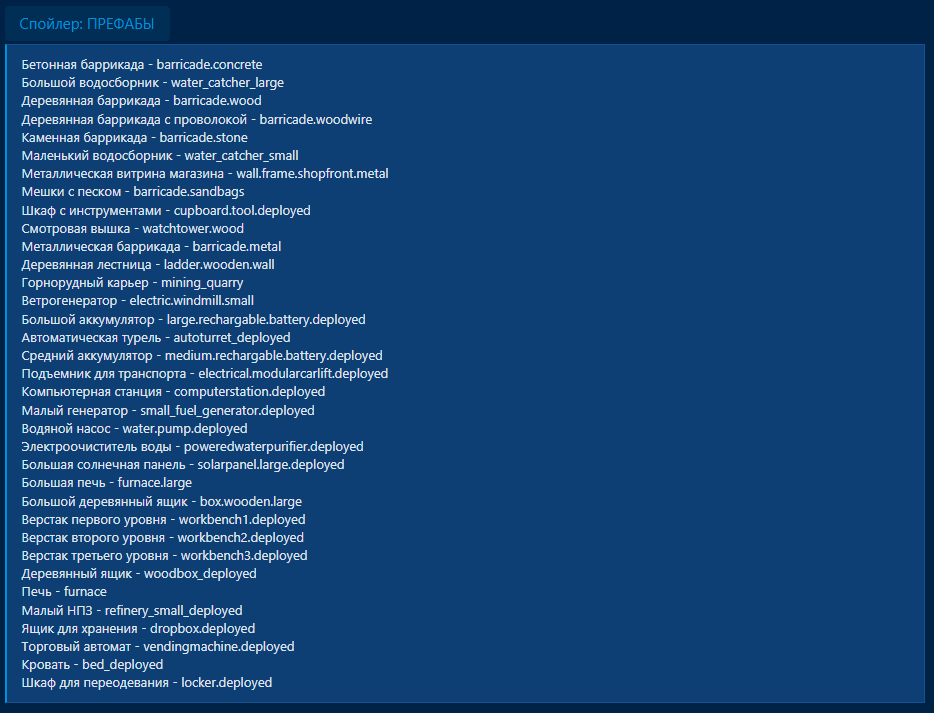 - Настройка списка защищаемых префабов помимо строительных блоков, дверей, больших стен и ворот (они защищены по умолчанию).